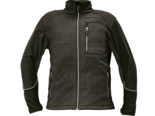 pánský celopropínací svetr z melírovaného úpletu uvnitř počesaná; zesílená část v oblasti ramen a rukávů sofsthellovým materiálem v kontrastní barvě; 1 náprsní kapsa na zip; 2 postranní kapsy na zip; nastavitelná šíře spodního obvodu; dekorativní reflexní paspulka na rukávu, očko na palec