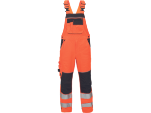 pánské HI-VIS pracovní kalhoty s laclem; dvojice tištěných 7,5 cm reflexních pruhů; elastický pas; 6 funkčních kapes; 600D Oxford zesílení v oblasti kolen s možností vkládání kolenních výztuh; dekorativní prošití v kontrastní HI-VIS barvě; nastavitelné délka nohavic.