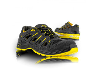 Sandál bezpečnostní ESD - kožený v kombinaci s textilem, NON METALIC. Svršek: broušená hovězinová useň VELUR v tloušťce 1,7 - 1,9 mm, podšívka: laminovaná prodyšná textilie MESH, vkládací stélka: HI-POLY - anatomicky tvarovaná z lehčené polyuretanové pěny potažená textilií MESH, antistatická, podešev: PU/PU - olejivzdorná, antistatická, protiskluzová, dvousložkový nástřik. Norma ČSN EN ISO 20345:2012 | ČSN EN ISO 61340-5-1:2012 Provedení S1 ESD SRA - s kompozitní tužinkou a kevlarovou planžetou - antistatické vlastnosti ESD
