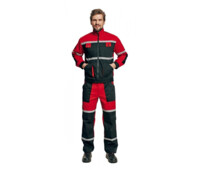 Bunda TAYRA červená/černá montérková řada TAYRA - olejivzdorná a voděodolná impregnace • stojáčkový límec • zapínání na zip a kovový knoflík • zesílené lokty na rukávech, manžeta s knoflíkem • 2 našité náprsní kapsy s úzkými klopami a kovový knoflík • vzadu stahovací pásek • reflexní doplňky – 2,5 cm široké pásy. Materiál: 35 % bavlna, 65 % polyester