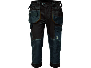Pánské pracovní 3/4 kalhoty. Elastický inovativní materiál TRIFIBETEX; ergonomický střih; snížený pružný pas; odolné trojité prošití nohavic a sedu; zesílená kapsa na nákoleníky z materiálu Oxford; prostorné multifunkční přední kapsy s poutky na nářadí; dvě zadní kapsy s klopou zesílené Oxfordem; stehenní kapsa na telefon s klopou a zapínáním na suchý zip; kapsa na metr a nůž; poutko na kladivo; "D" kroužek; poutko na nářadí v pase. Originální zpracování zapínání kalhot; reflektivní prvky v barevném odstínu.