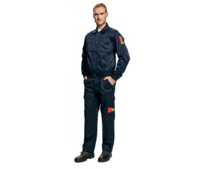 pánská pracovní bunda odolná teplu, plameni a statické elektřině, bavlna s trvalou nehořlavou úpravou; zapínání kryté klopou na suchý zip; 2 náprsní kapsy kryté klopou přišitou na bocích, 2 kryté vnitřní kapsy; rukávy s pružnou manžetou; bunda ukončená širokým, na bocích pružným lemem.