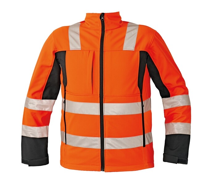 pánská HI-VIS softshellová voděodolná bunda; reflexní pruhy přes ramena, okolo boků a rukávů; 2 postranní kapsy na zip, 1 náprsní kapsa na zip; stahování ve spodní části; velcro nastavení šíře rukávů.