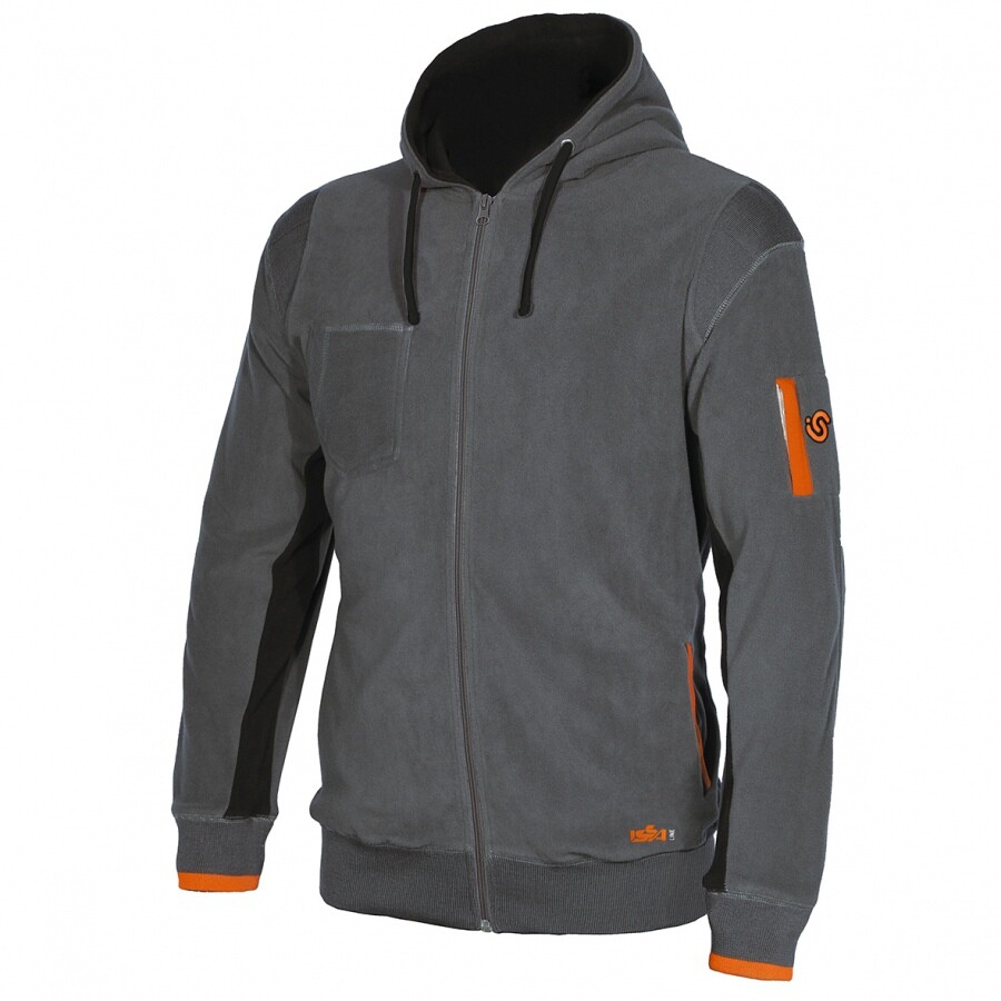 Mikrofleece mikina se čtyřmi kapsami, pevnou kapucí a elastickou vložkou pro větší komfort. Je lehká a současně hřeje. Složení: Mikrofleece nežmolkující 100% polyester 160 g / m². Barva antracitová šedá s černými a oranžovými prvky.
