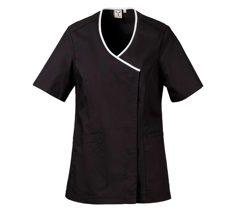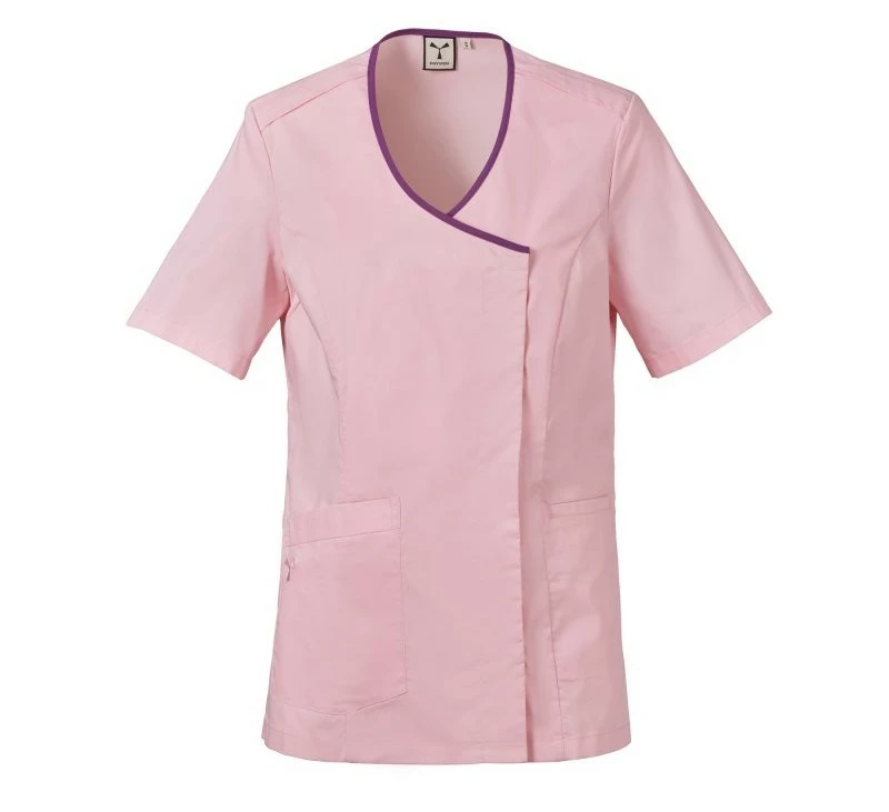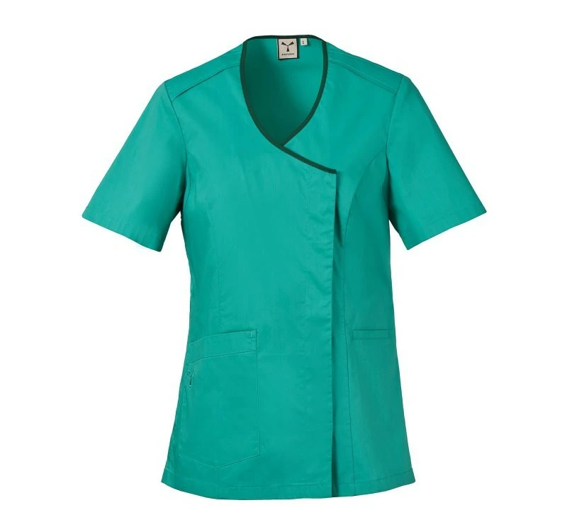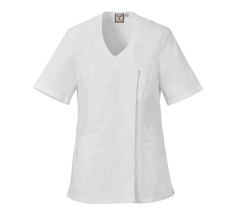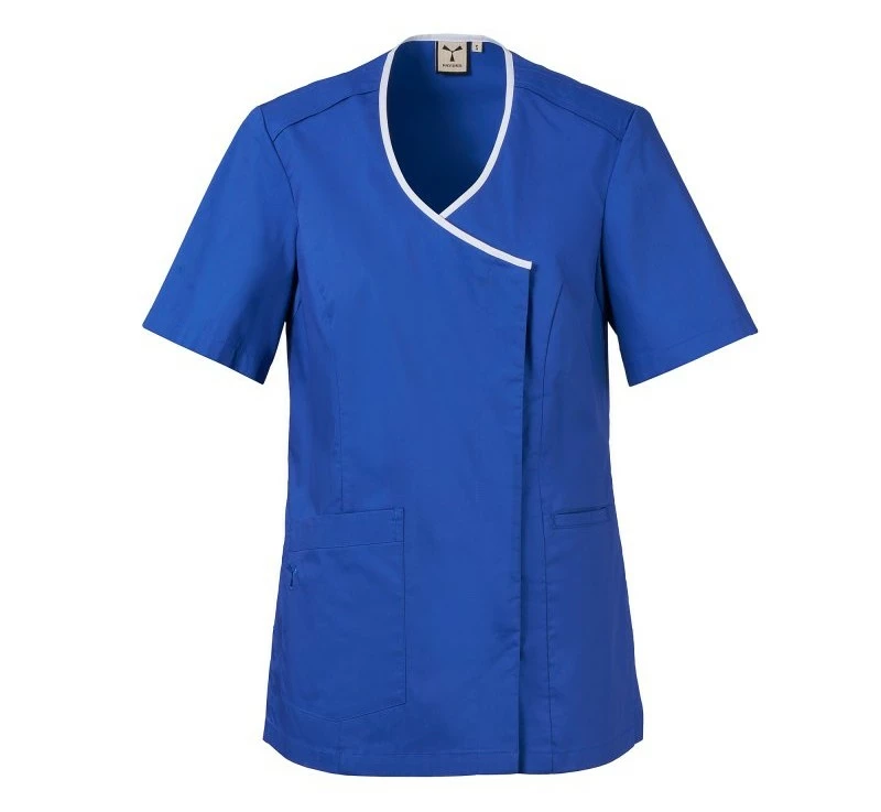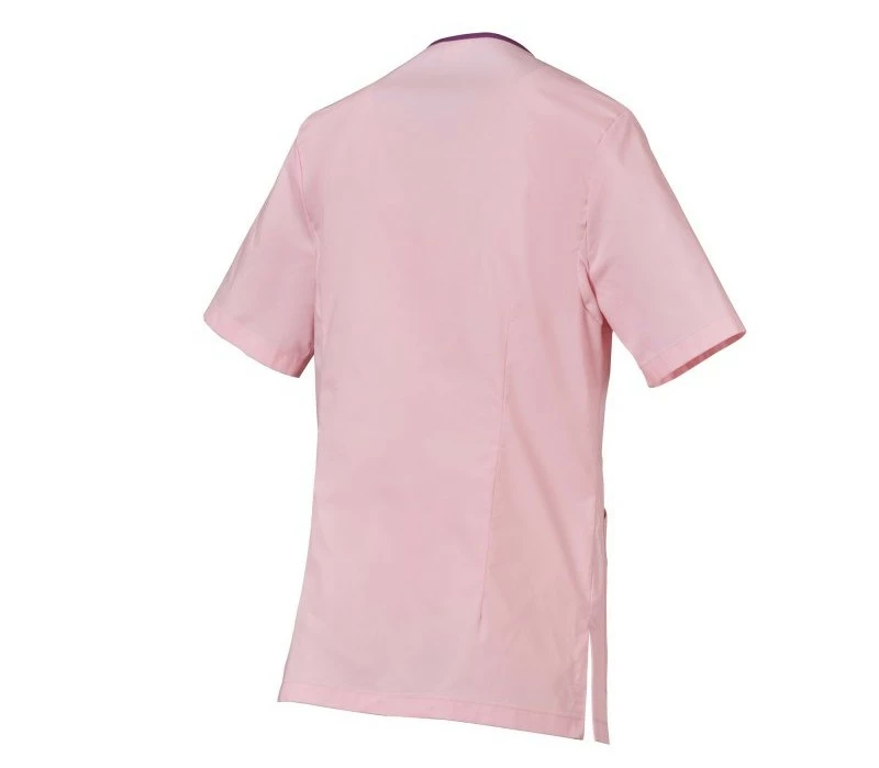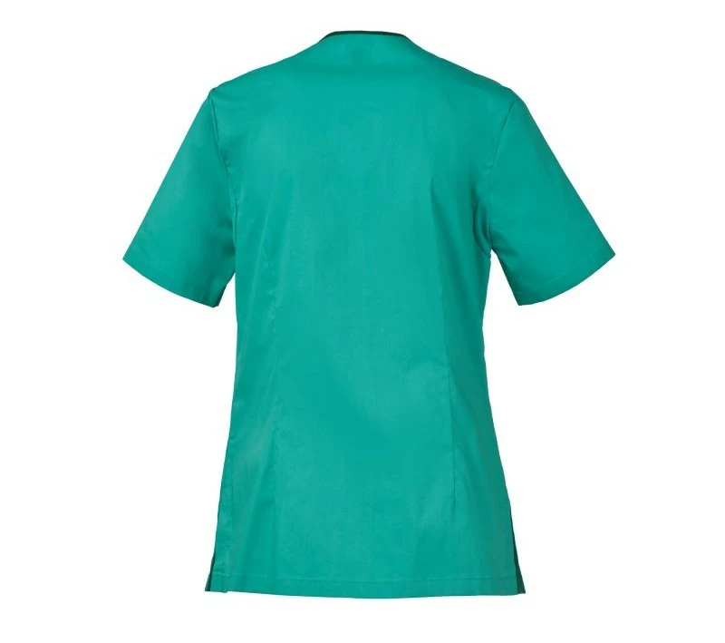 Dámský plášť s krátkým rukávem, z bavlněného popelínu, polyesteru a Lycry ® T400 ®, s vynikajícími elastickými a prodyšnými vlastnostmi. Výstřih do V s kontrastním barevným lemem. Zapínání na skryté druky a lehká síťovaná luneta v podpaží pro zlepšení prodyšnosti. Dvě kapsy ve spodní části: jedna prostřižená a jedna našitá s ikonickou vyšívanou vrtulí tón v tónu. Boční rozparky a záševky na zádech.