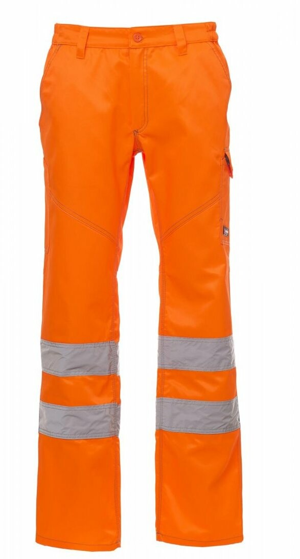 Pánské kalhoty, celoroční, s vysokou viditelností s reflexními pruhy, elastické pásky na bocích a poutka v pase, zapínání na plastový zip a na knoflík, dvě přední kapsy klasického střihu, jedna postranní kapsa LOCK SYSTEM, jedna kapsa na svinovací metr, dvě zadní kapsy, z nichž jedna otevřená a druhá s klopou na suchý zip. Kontrastní prošití, v rozkroku a na vnitřní straně nohavice s trojjehlovým prošitím.