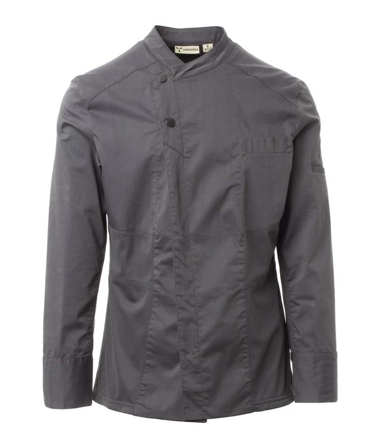 Pánský kuchařský rondon se šálovým límcem, z bavlněného ripstopu a Lycry ® T400 ®, s vynikajícími elastickými a prodyšnými vlastnostmi, s pohodlnou síťovinou na zádech, v podpaží, průramkách a na bocích pro zvýšení prodyšnosti. Dvouřadé zapínání na patentky. Dlouhé rukávy s košilovou manžetou se zapínáním na nezakrytou patentku. Ikonická tvarovaná nášivka v horní části zad, s výšivkou vrtule tón v tónu. Kapsička na pero na levém rameni a kapsička na hrudi.