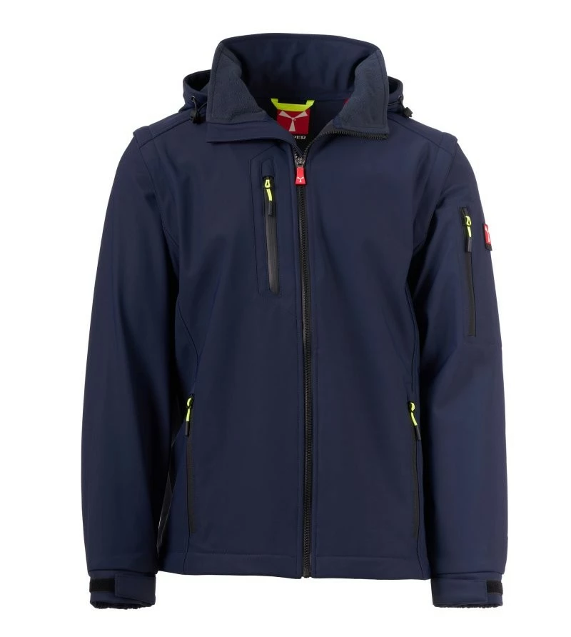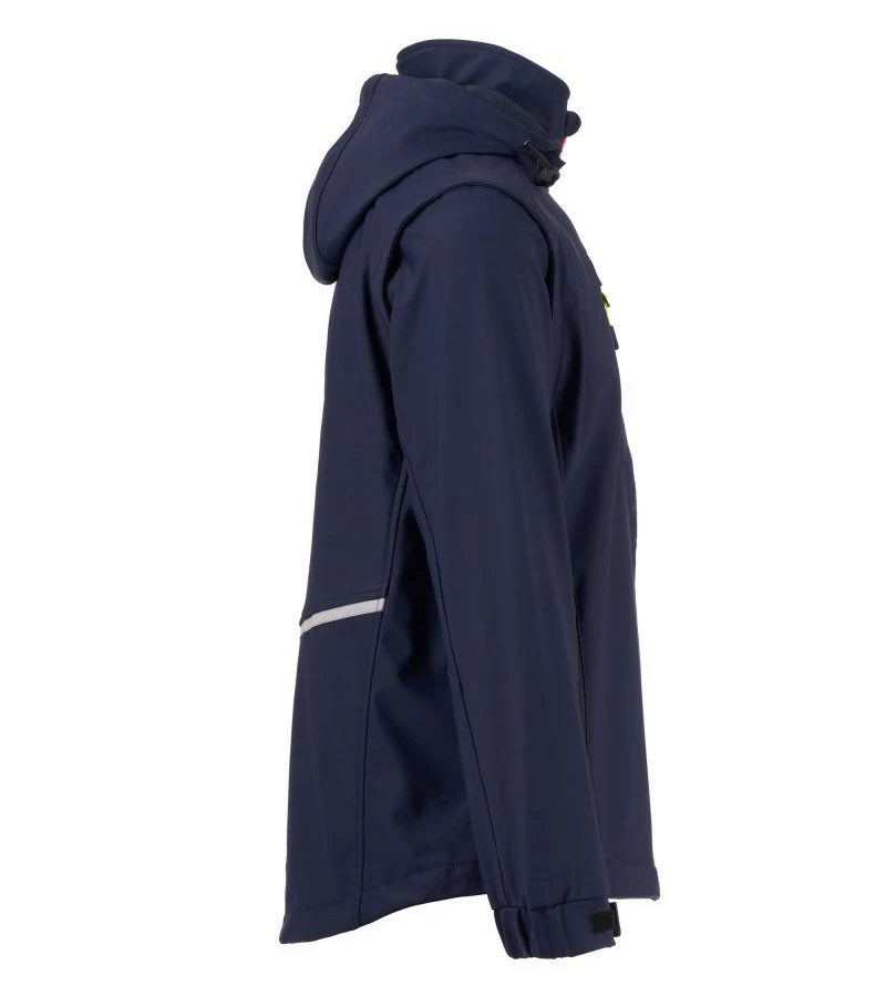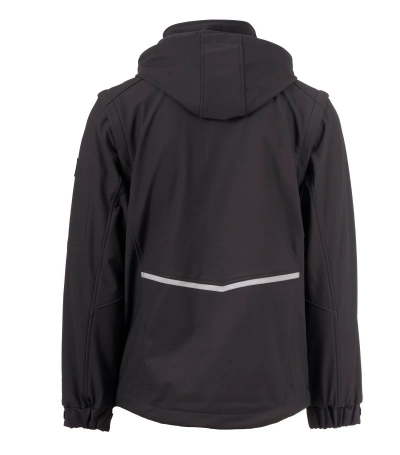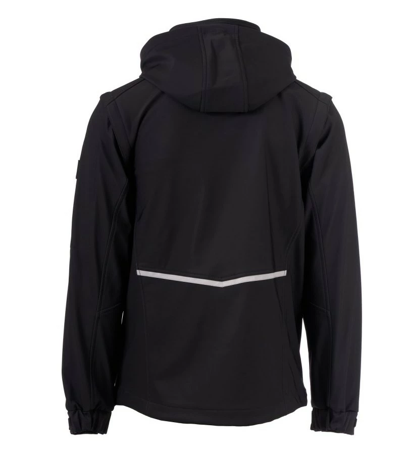 Pánský zateplený softshell 3 vrstvy, odnímatelné rukávy, zapínání na zip SBS s kovovým jezdcem „semi-auto lock“ a přizpůsobeným taháčkem. Odnímatelná kapuce se stahovací šňůrkou. Reflexní pásky ve spodní části zad a zadní straně kapuce. Elastické stahovací manžety na suchý zip. Dvě boční kapsy na zip, jedna kapsa na hrudi s voděodolným zipem a jedna kapsa na levé paži s integrovaným očkem na pero na zip. Fluorescentní taháčky. Jedna vnitřní prostřižená kapsa na suchý zip. Spodní část stažitelná pomocí přizpůsobených zarážek.