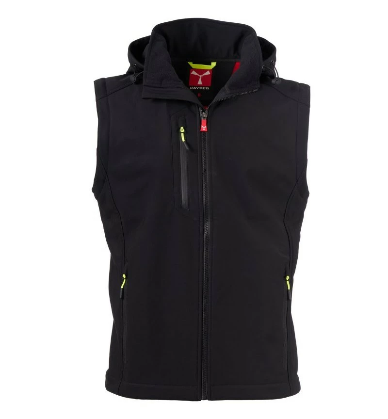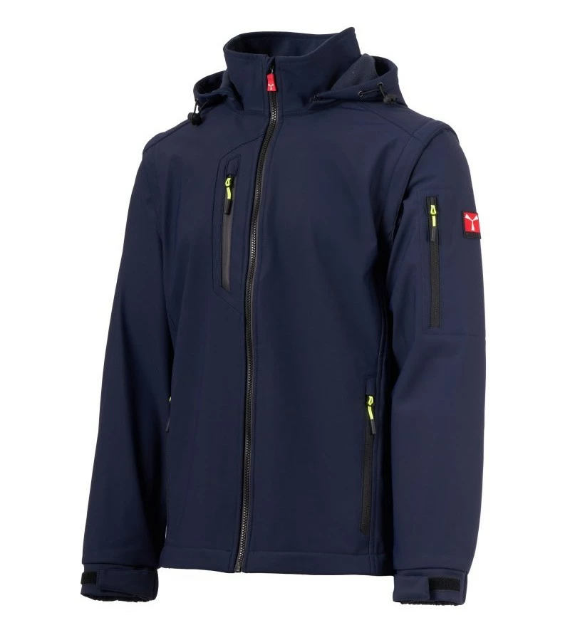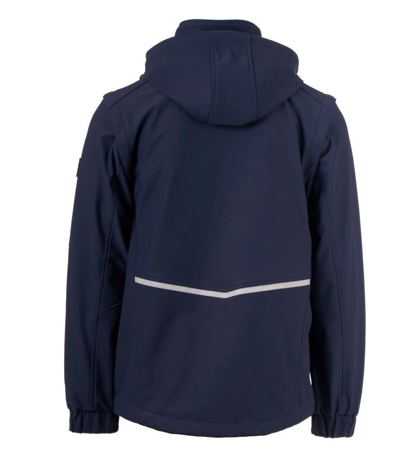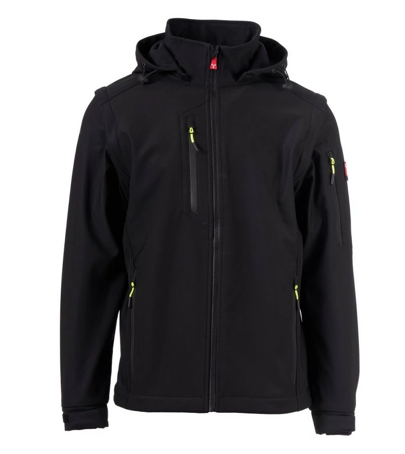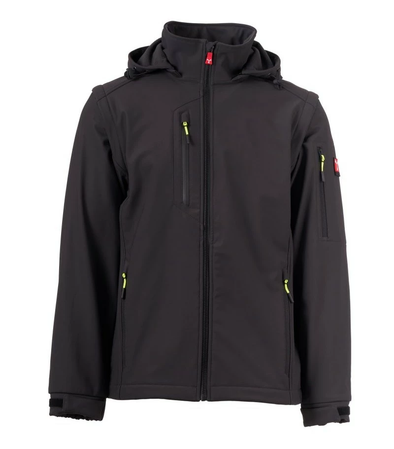 Pánský zateplený softshell 3 vrstvy, odnímatelné rukávy, zapínání na zip SBS s kovovým jezdcem „semi-auto lock“ a přizpůsobeným taháčkem. Odnímatelná kapuce se stahovací šňůrkou. Reflexní pásky ve spodní části zad a zadní straně kapuce. Elastické stahovací manžety na suchý zip. Dvě boční kapsy na zip, jedna kapsa na hrudi s voděodolným zipem a jedna kapsa na levé paži s integrovaným očkem na pero na zip. Fluorescentní taháčky. Jedna vnitřní prostřižená kapsa na suchý zip. Spodní část stažitelná pomocí přizpůsobených zarážek.