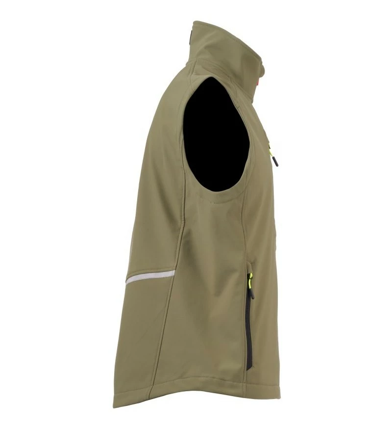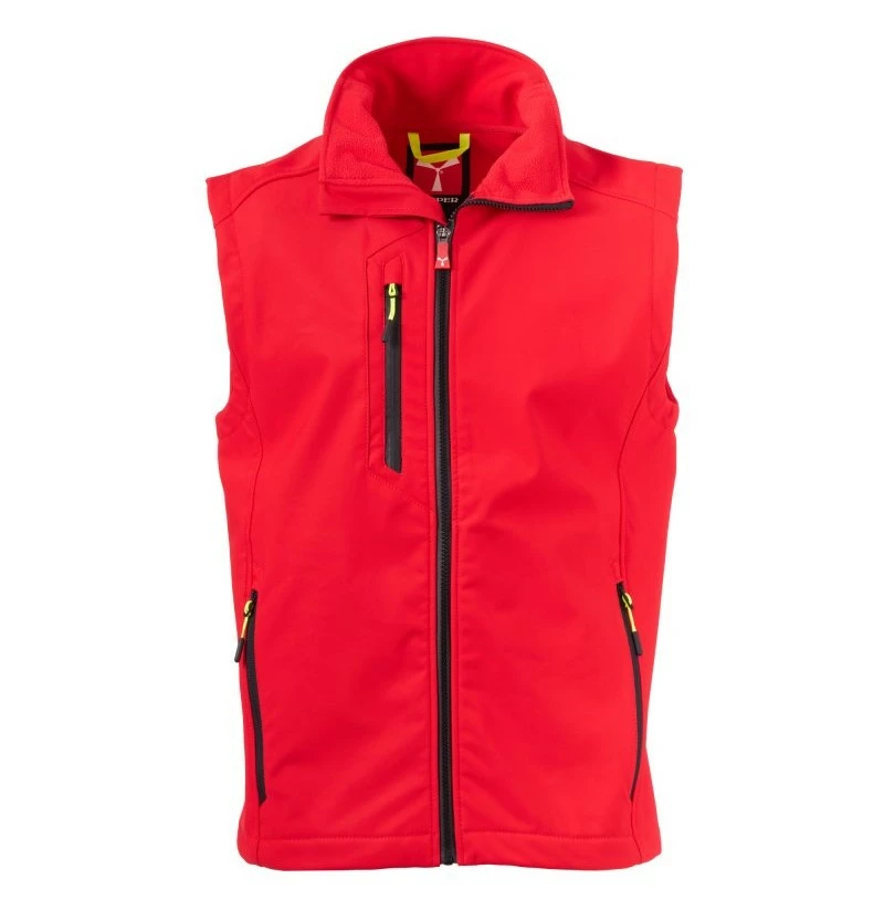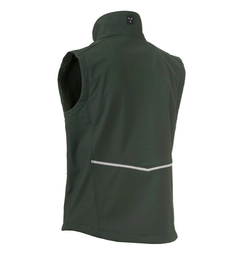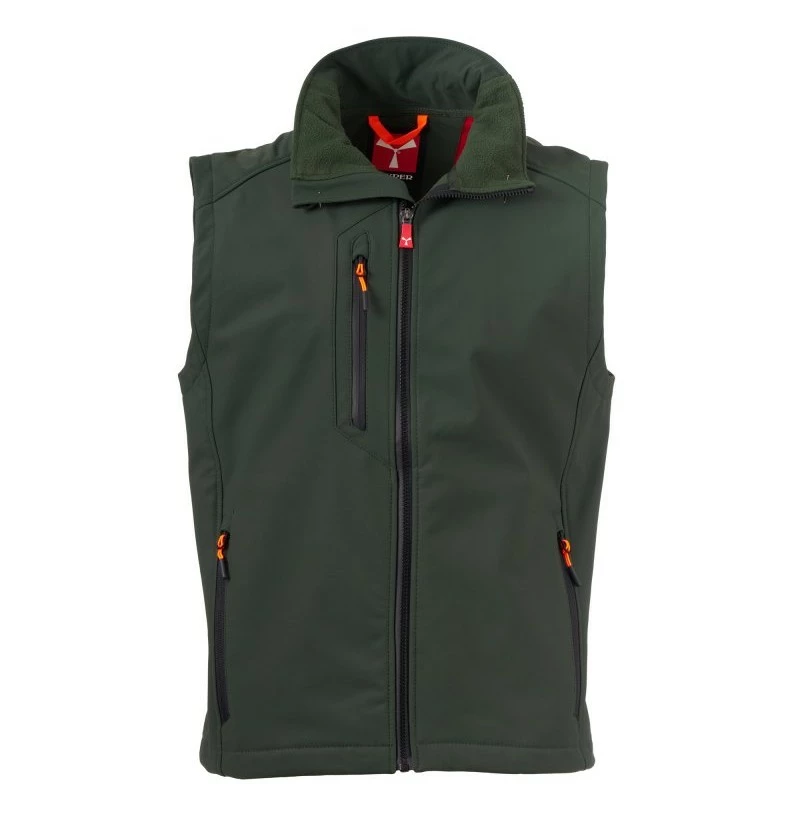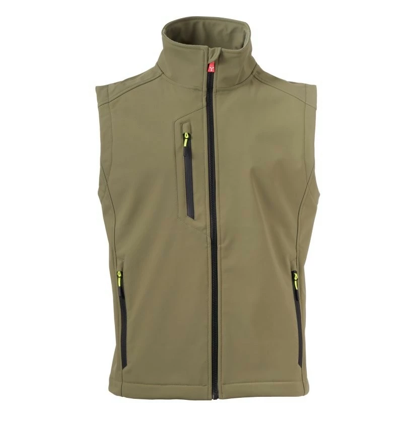 Pánská lehká softshellová vesta, 3 vrstvy, zapínání na zip SBS s kovovým jezdcem „semi-auto lock“ a přizpůsobeným taháčkem. Reflexní páska ve spodní části zad. Dvě boční kapsy na zip, jedna kapsa na hrudi s voděodolným zipem. Fluorescentní taháčky. Jedna vnitřní prostřižená kapsa na suchý zip. Spodní část stažitelná pomocí přizpůsobených zarážek.