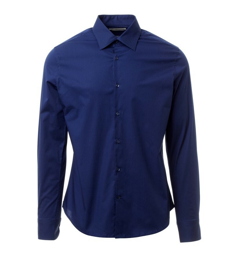 Pánská košile slim střihu, tvarovaný italský límeček s uzavřeným stojáčkem a odnímatelnými kosticemi, vnitřní nařasená léga, viditelné zapínání, hladké zádové sedlo, záševky uprostřed zad, zakončení látkovým klínkem na bocích, zaoblené manžety s 1 knoflíkem.