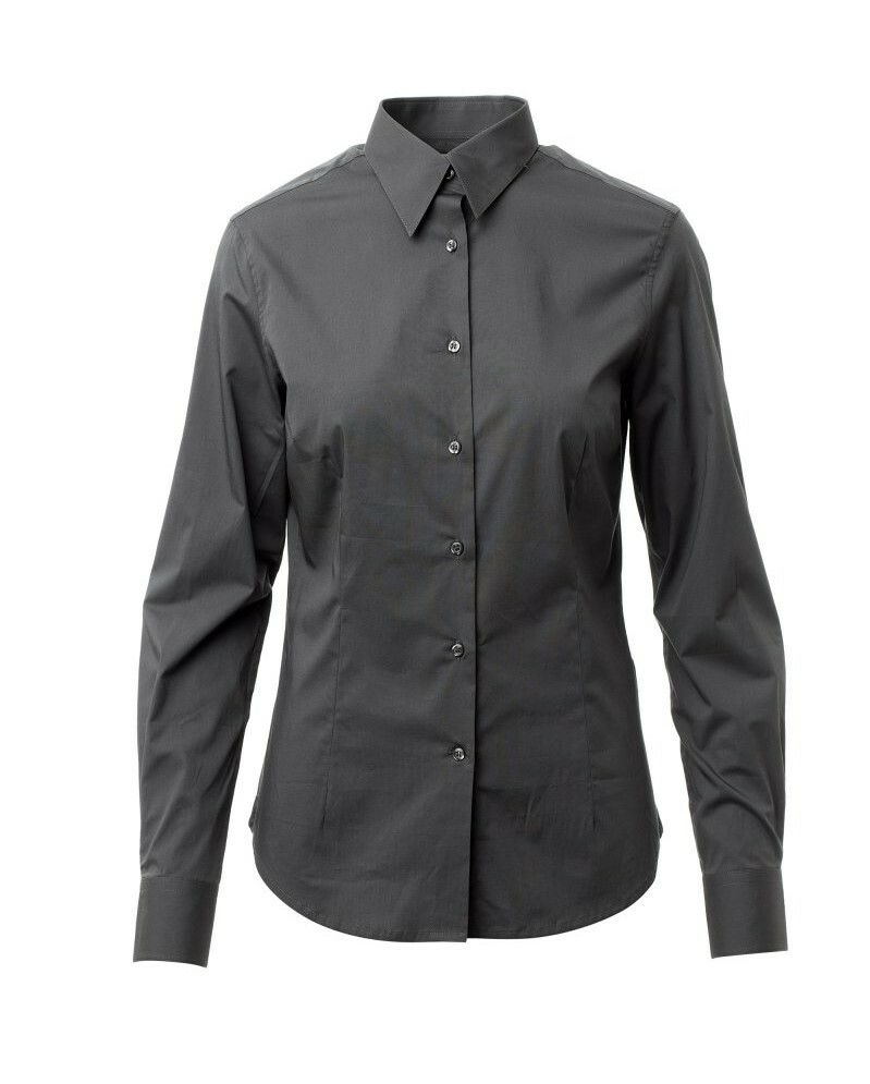 Dámská košile slim střihu, tvarovaný italský límeček s uzavřeným stojáčkem, vnitřní nařasená léga, viditelné zapínání, hladké zádové sedlo, záševky na přední i zadní straně, zakončení látkovým klínkem na bocích, zaoblené manžety s 1 knoflíkem.