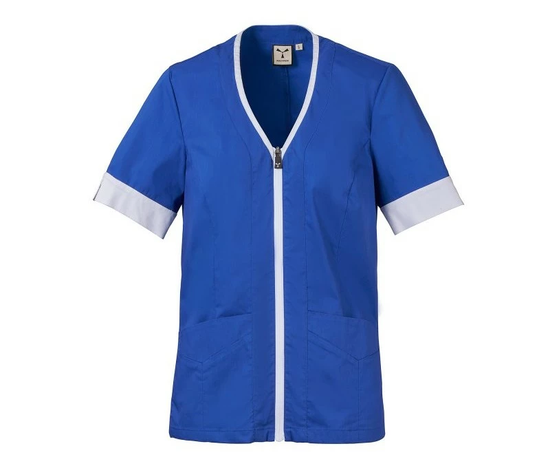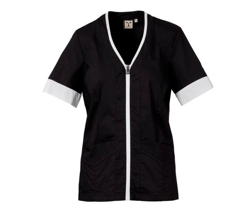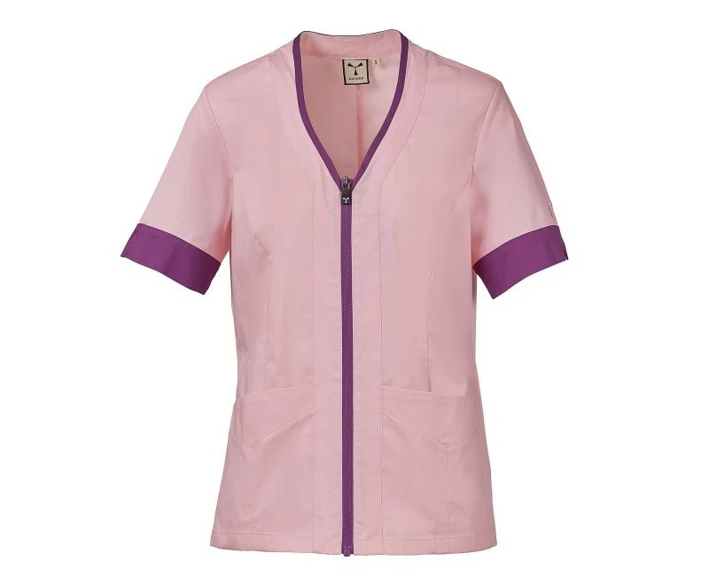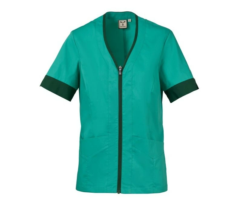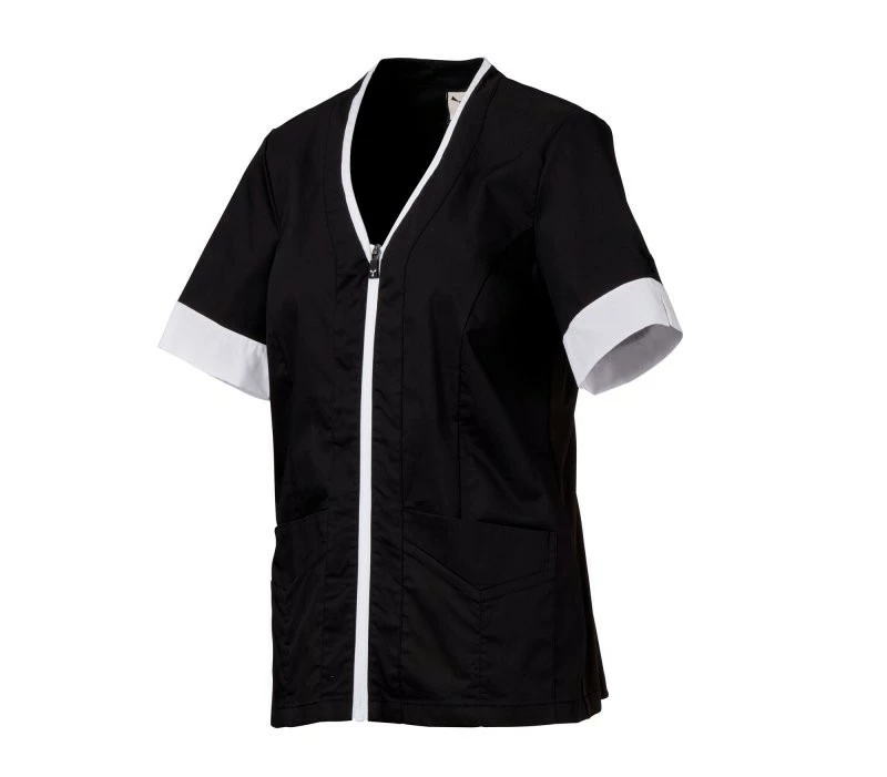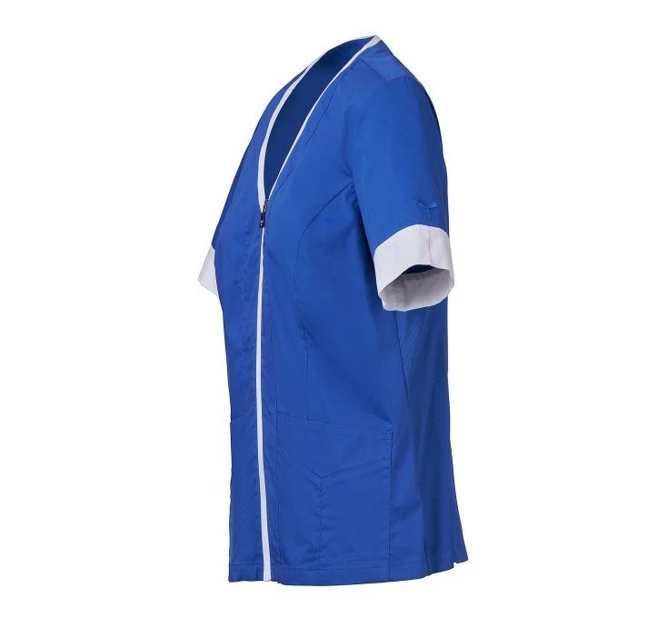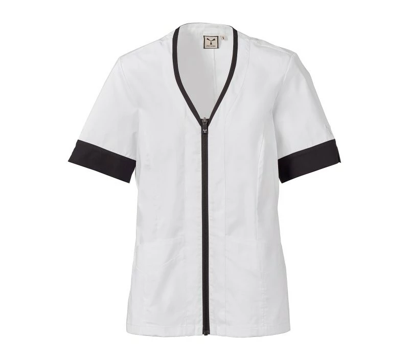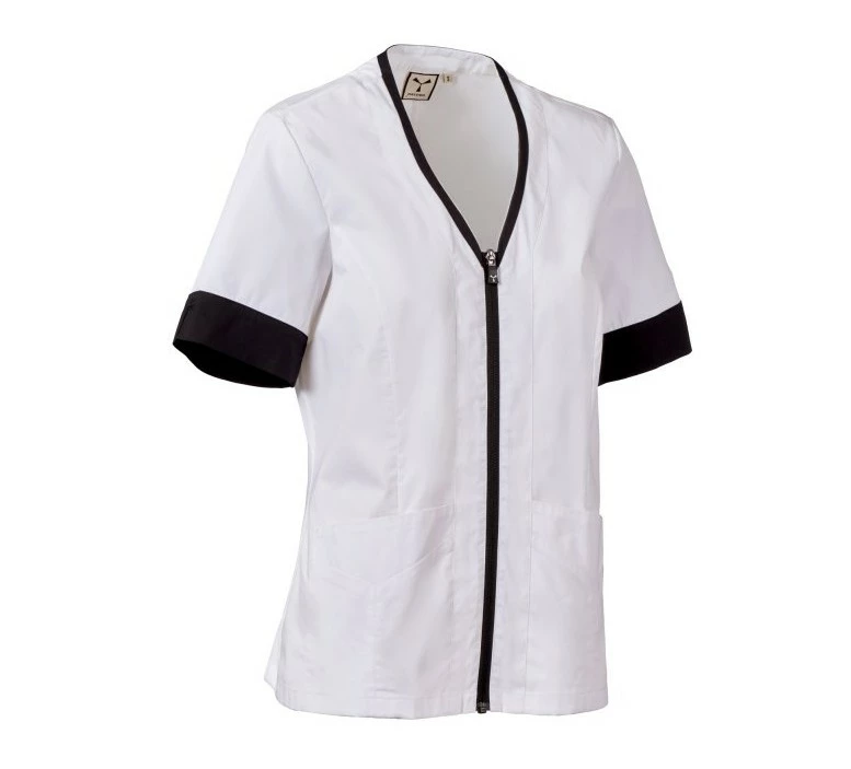 Dámský plášť s krátkým rukávem, z bavlněného popelínu, polyesteru a Lycry ® T400 ® v kombinaci s pohodlnou síťovinou v zadní části boků pro usnadnění pohybu a zlepšení prodyšnosti. Výstřih do V zakončený kontrastním barevným lemem. Středové zapínání na zip a kontrastní jezdec „semi auto-lock“. Dvě spodní našité kapsy s klopou. Rukávy s kontrastními okraji, z nichž jeden má ikonickou vrtuli Payper vyšívanou tón v tónu.