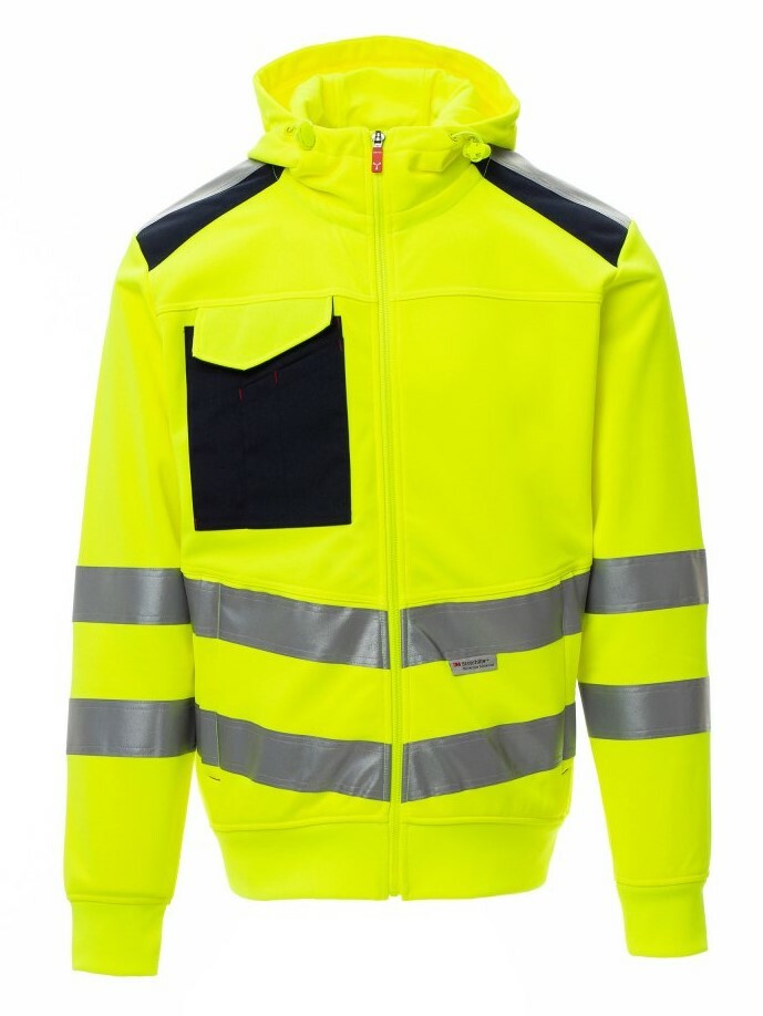 Pánská mikina s vysokou viditelností, s kapucí a s reflexními pruhy, s plastovým celozipem SBS s kovovým jezdcem s aretací autolock, manžety a pas s elastickým žebrováním, dvě přední kapsy se skrytým zipem, jedna víceúčelová kapsa na hrudi s kroužkem na jmenovku a uzavírací klopa LOCK SYSTEM.