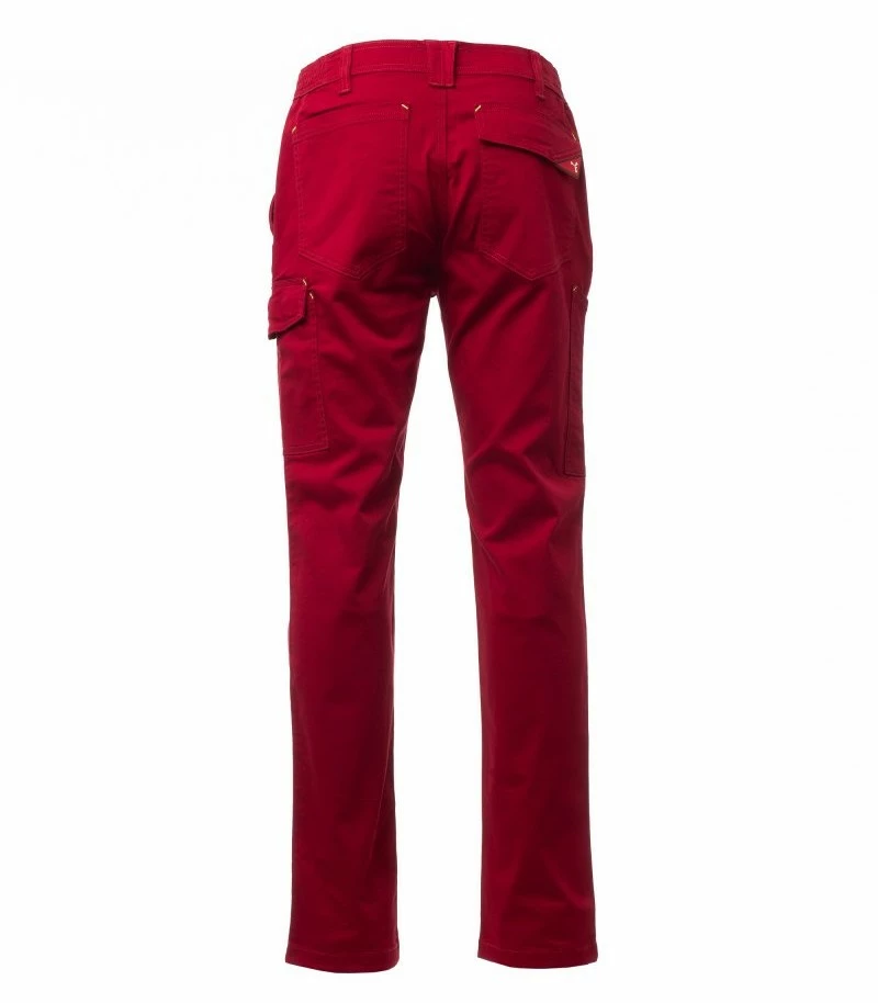 Kalhoty s poutky a s elastickým páskem v pase, zapínání na zip a knoflík, zpevněné prošití trojjehlou v rozkroku a na vnitřní straně nohavice, prošití na boku dvojjehlou, dvě přední kapsy klasického střihu, kapsička na mince, pravá postranní kapsa na svinovací metr, levá postranní kapsa s uzavírací klopou LOCK SYSTEM, dvě zadní kapsy, z nich jedna s klopou na suchý zip.
