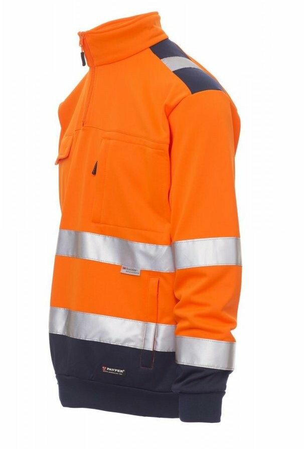 Pánská mikina s vysokou viditelností s reflexními pruhy 3M, nylonový polozip s kovovým jezdcem, manžety a pas s elastickým žebrováním, dvě přední kapsy se skrytým zipem, jedna kapsa na hrudi s klopou LOCK SYSTEM s odnímatelným a zavíracím pružným pouzdrem na jmenovku, jedna kapsa na zip se zesílenými švy.
