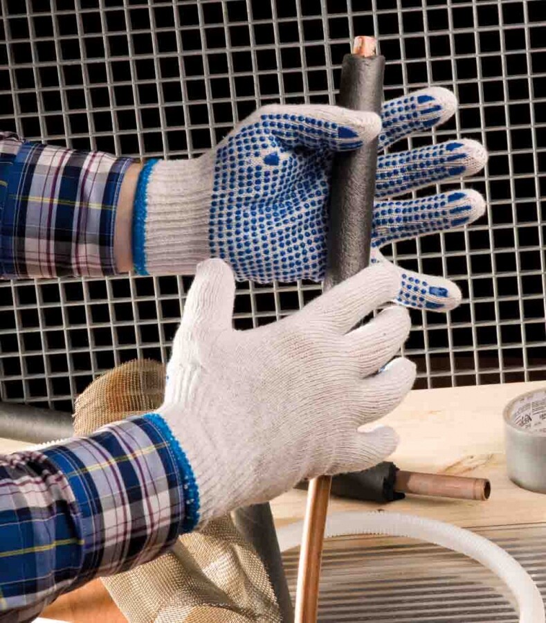 Pletené bezešvé rukavice ze směsi polyester/bavlna, s PVC terčíky v dlani a na prstech.